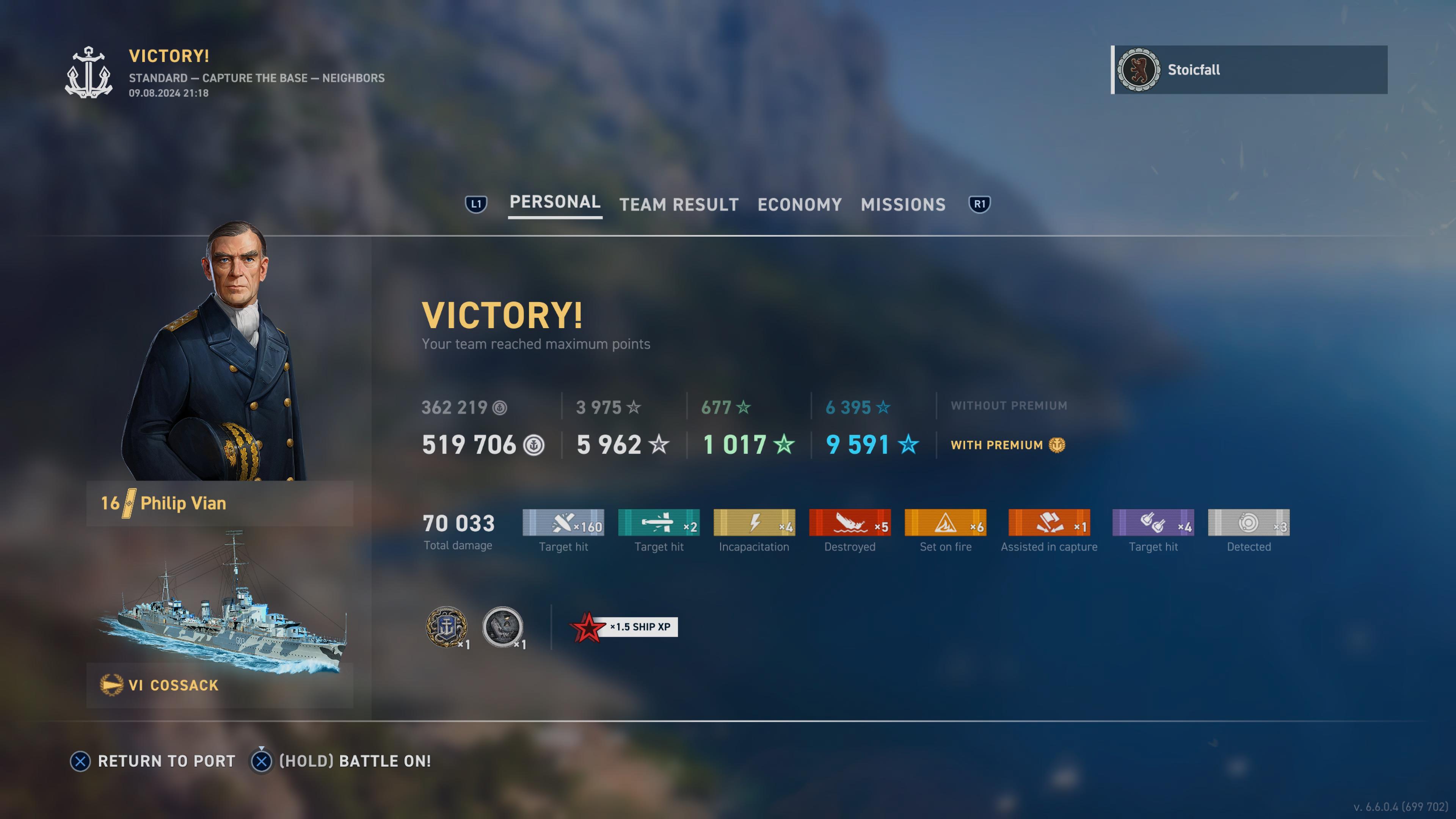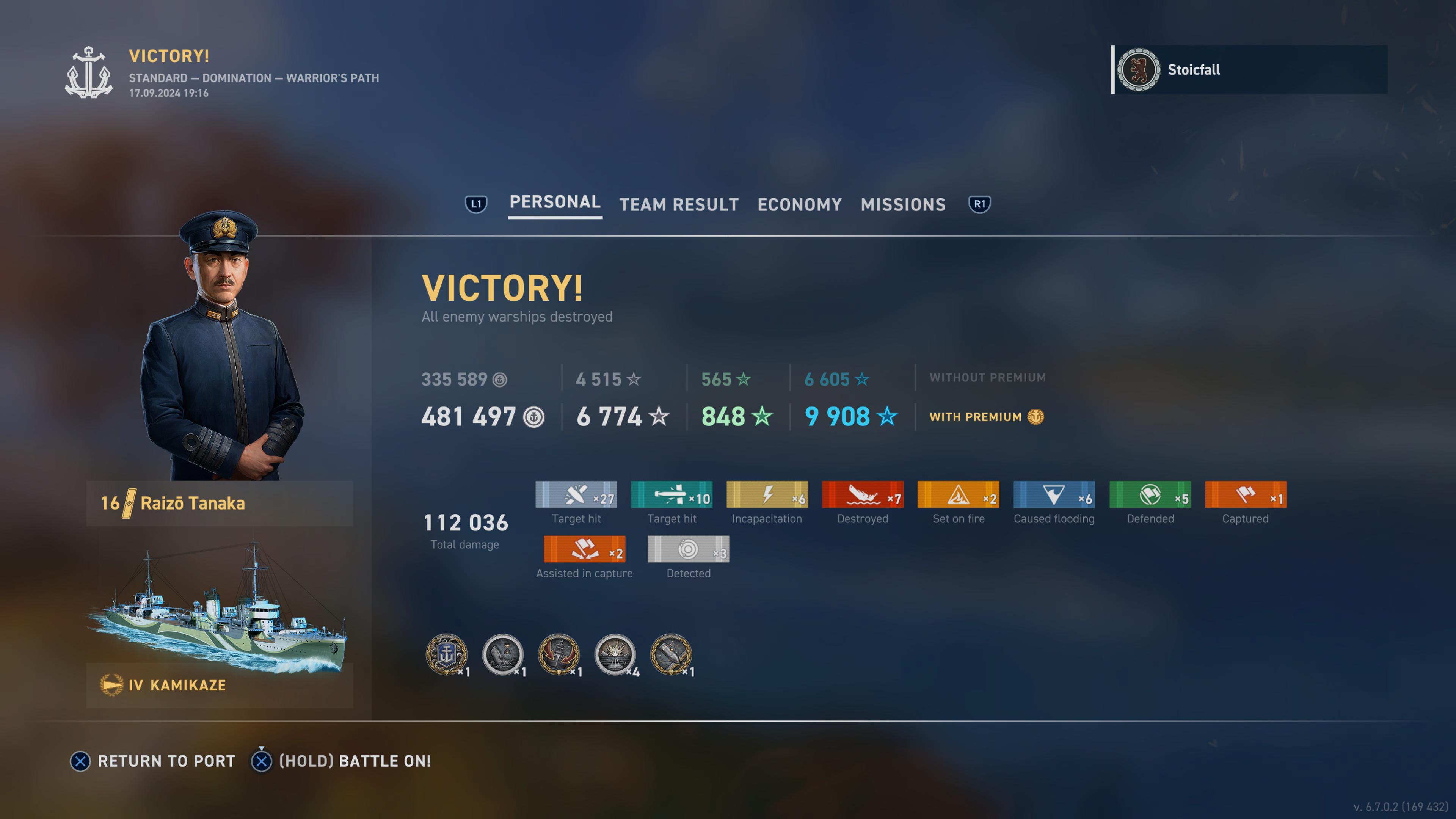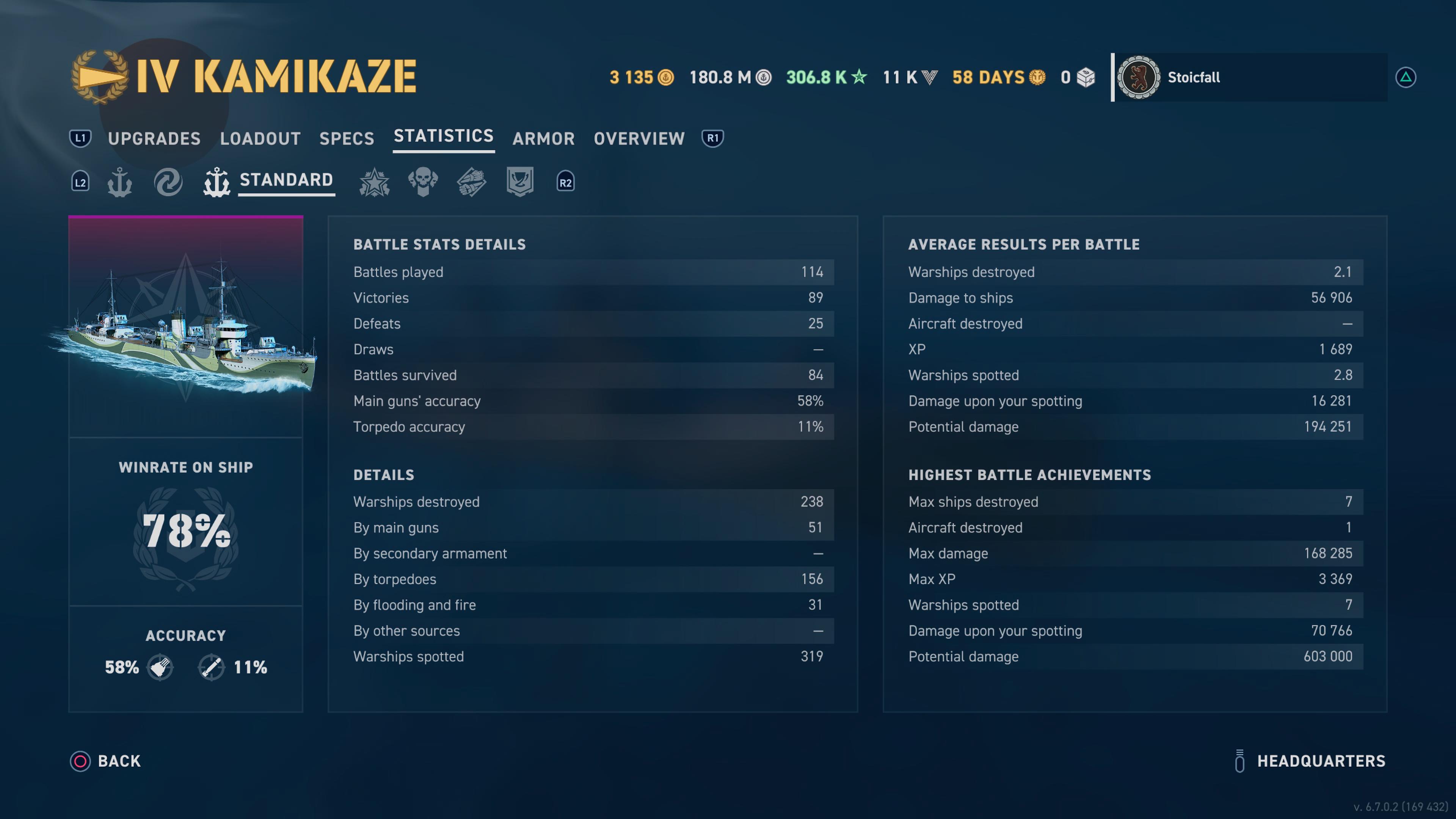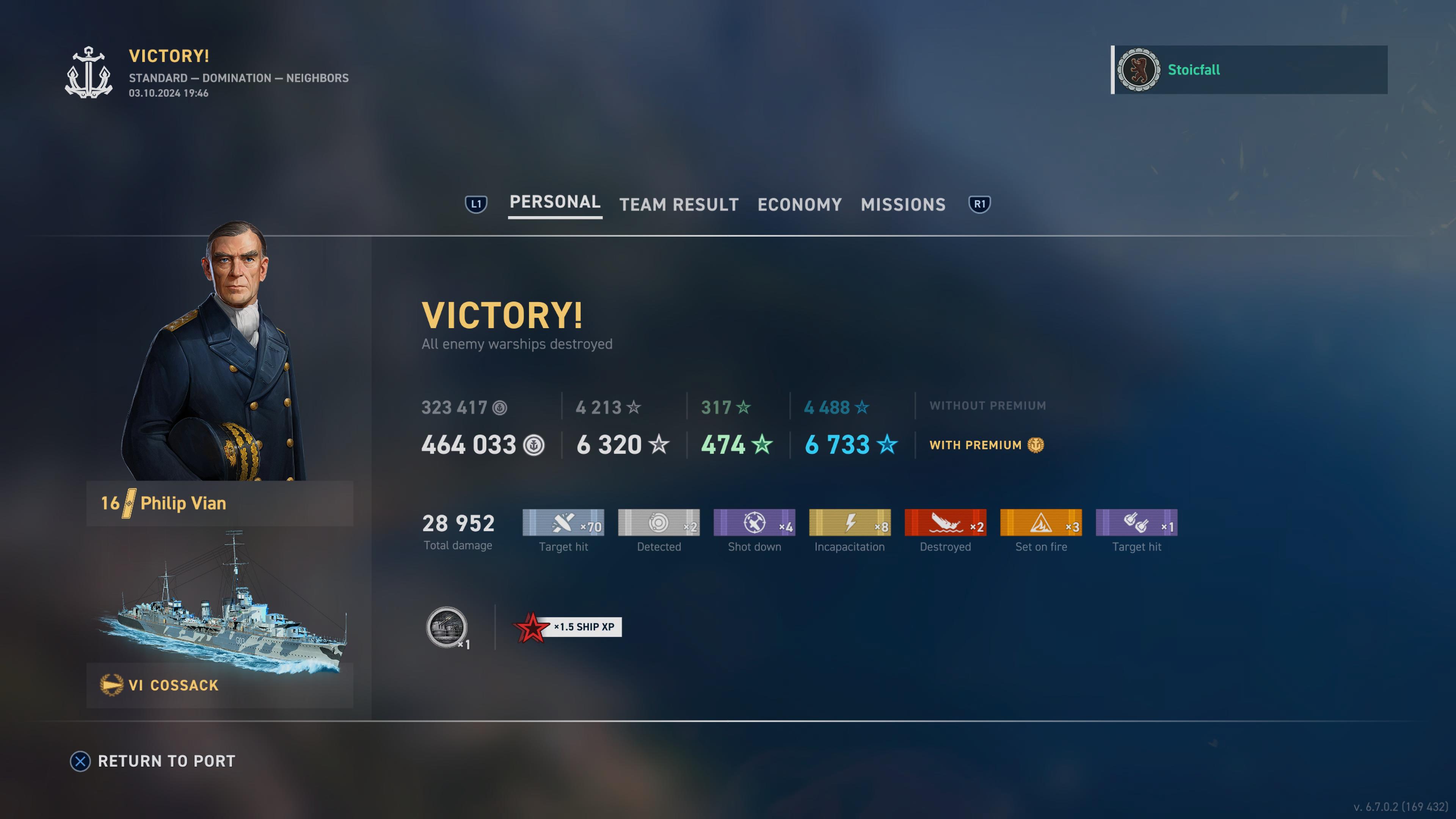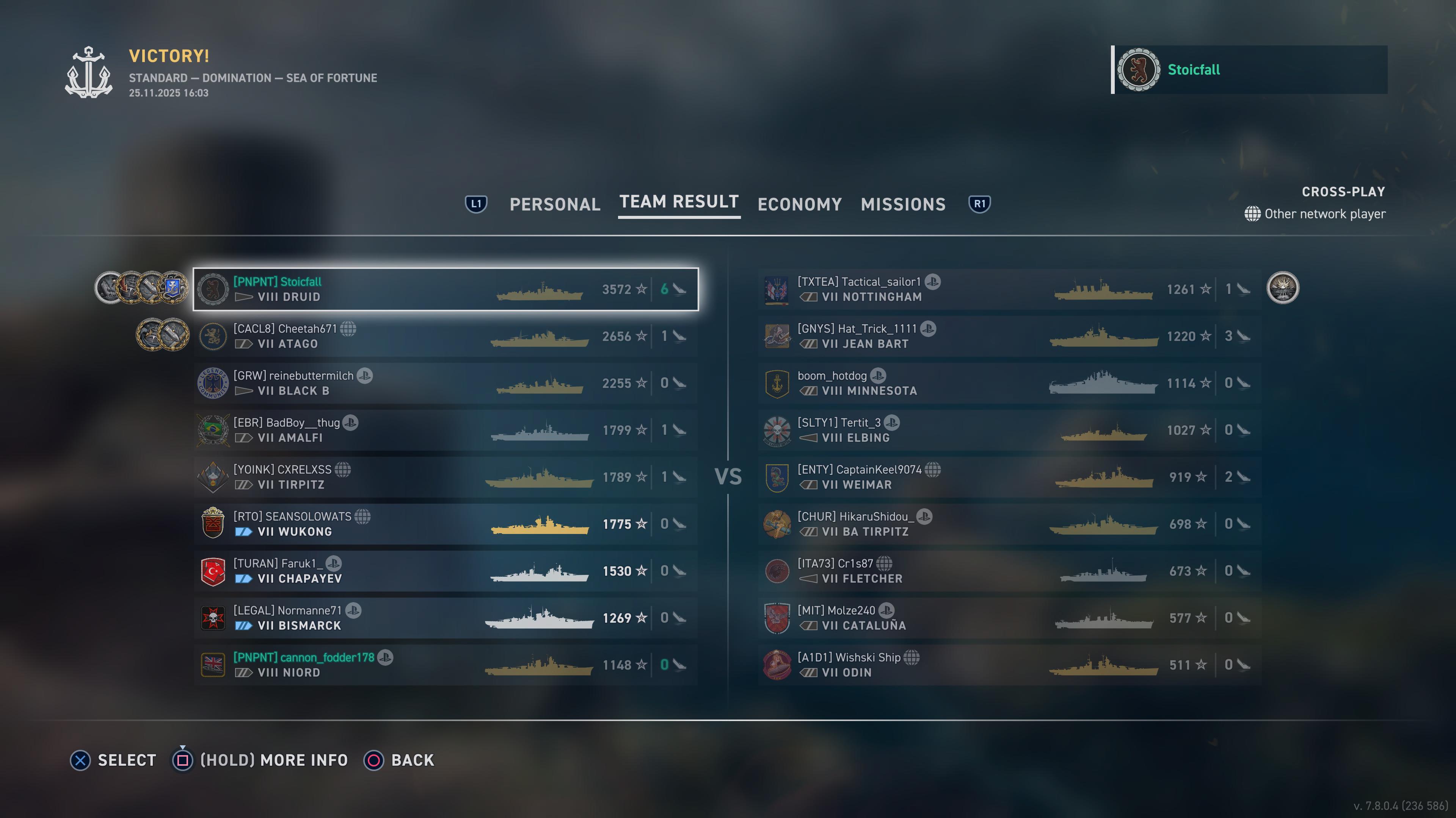 I acquired the pre-war version of Cossack in August 2024 and my first game was underwhelming. The ship lacks the sonar of the later Cossack, has longer reloading torpedoes, and although it has an extra gun turrent, the reload time is slightly increased. However, my second game was a four kill damage fest which was so very nearly a Kraken (a Warspite pinched the one-shot destroyer I was about to finish off). Naturally, I enjoyed it. You must lean completely into the guns and bully other destroyer players, set battleships on fire, and avoid cruisers. The torpedoes are there if you need them: Example 1, Example 2, and Example 3. I shall be playing both Cossacks a lot from now on.