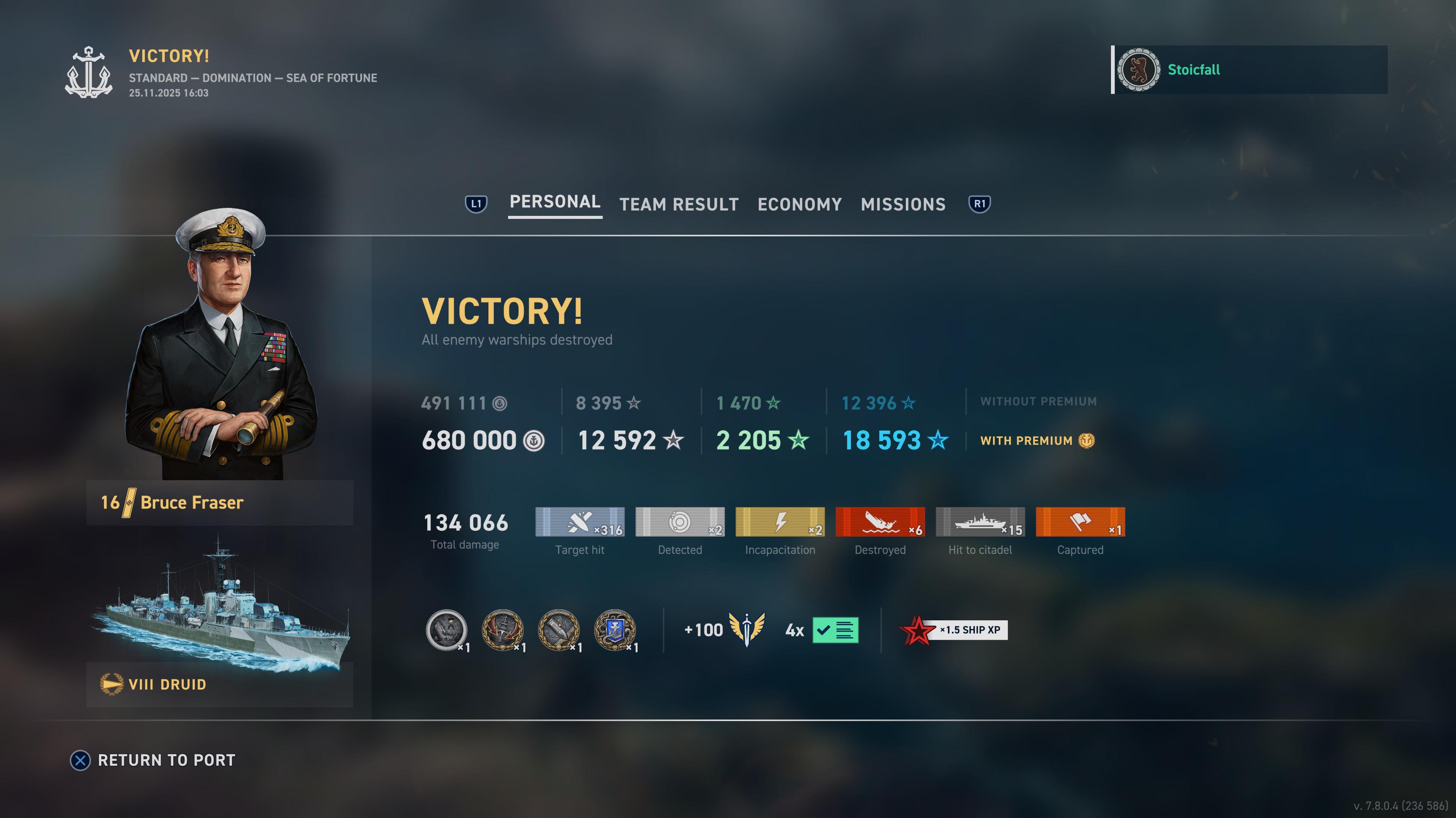 It cost me two years of Steel (25,000) but it was worth it! Druid is not an easy ship to play. I couldn't quite make it work with Philip Vian, especially as the only viable option in slot 1 was improved AA; not great since most tier VIII matches don't contain a carrier. I tried running Bruce Fraser for increased AP penetration, torpedo detection, speed, rudder shift time, and fully packed. The legendary skill provides an extra smoke, heal, and sonar, yielding seven, three, and three respectively. The extra speed is also a great bonus. The only drawback is that when your engine or rudder are taken out and your damage control party is on cooldown, you are a sitting duck. However, if you can make sensible choices, this build can really work. Fraser's first time in command was a great success: a six kill game which included blowing up a Nottingham at close range and destroying an Elbing to claim the Kraken.