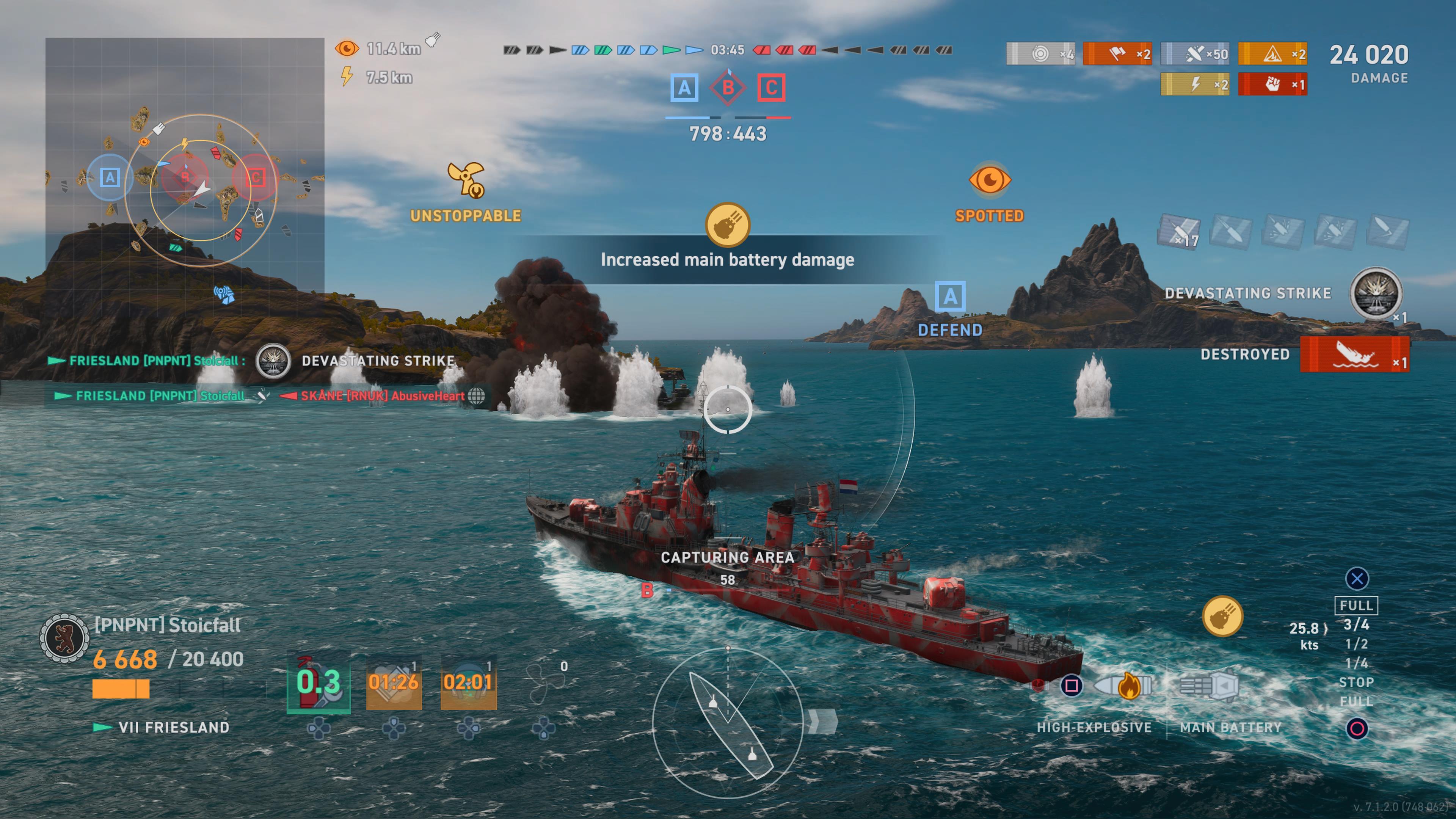 Your job is to spot the enemy ships for your team. Destroyers can get closer than other classes of ship without being seen. Battleships in particular rely on you to spot for them. Destroyers should also capture and defend the objective zones. Do not abandon your battleships. They can be blind and defenceless without you. For beginners, you should be firing High Explosive (HE) shells unless you are very close to a cruiser and its broadside is exposed. For around Tier VII and above, AP shells might be effective against broadside enemy destroyers and the superstructures of battleships. The optimal shell type can be fluid in a variety of situations. Destroyers firing AP can grind down battleships and rip into cruiser citadels. Start a fire or three, then hammer that AP home.