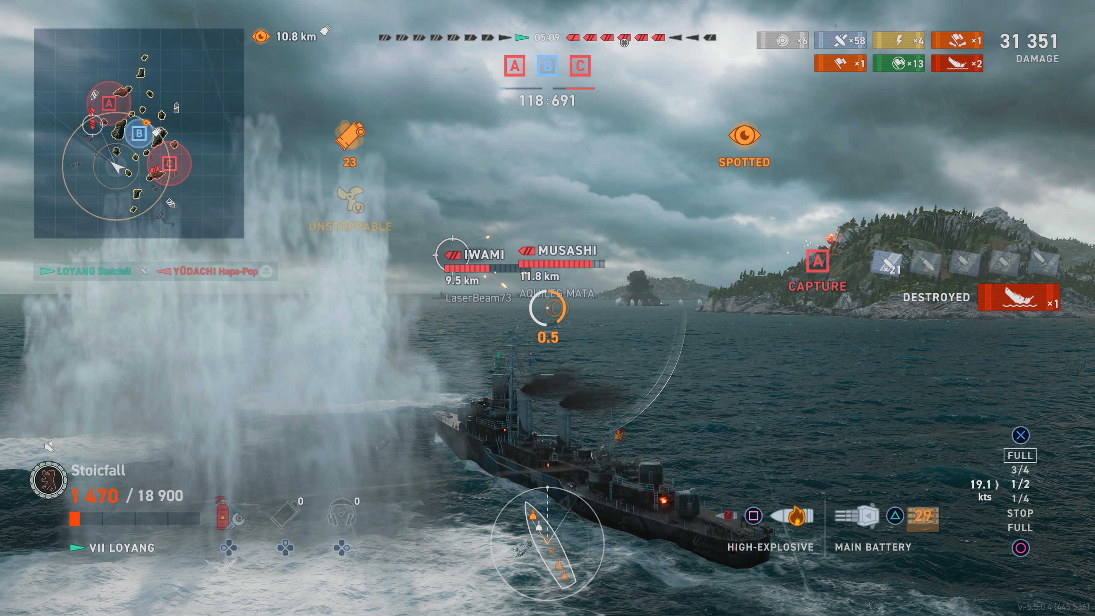 Once I was playing as a Legendary Tier destroyer and was forward enough to be spotting for my team, but far enough back that I was unsighted. I had nothing in particular to do in that moment but observe. I watched as two Yamatos were going hard at each other. Our Yamato managed to land a well aimed salvo which took out half the enemy battleship's health: "Wow!" I exclaimed. This was fun to watch and made me reflect on the fact that this game isn't always about constantly shooting and sailing all around the map in madness. Sometimes you have time to pause, reflect and at your leisure observe how other people play the game. Plus, since I was the one spotting, I earned a lot of XP from that brutal broadside. After a minute or so it was time to put my binoculars away and sail on toward the enemy Cap.