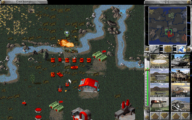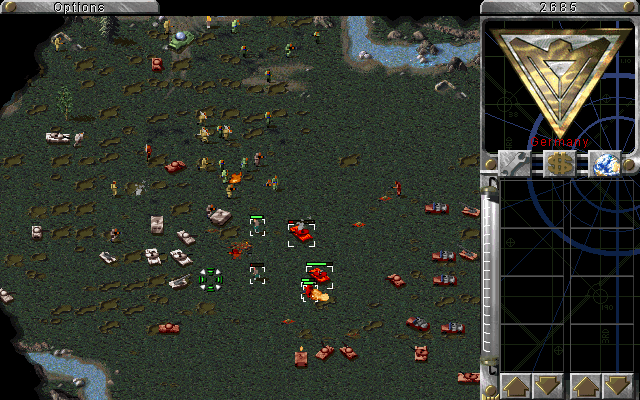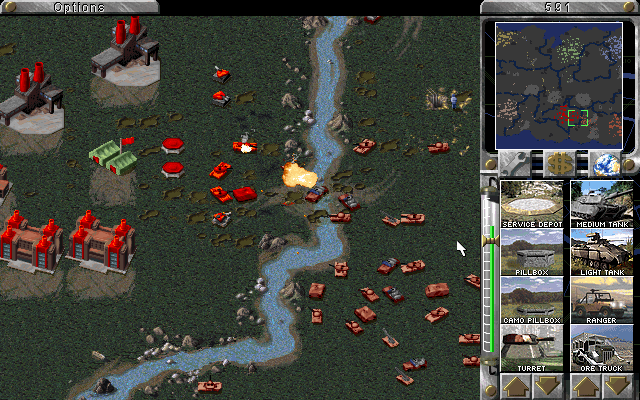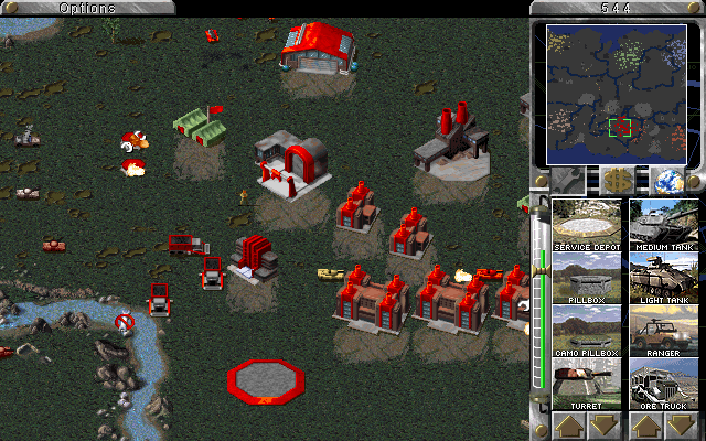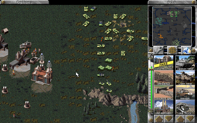 One time I played a versus game with an anonymous rogue on Westwood Chat (always prefer to play people I know because anonymous losers tend to quit prematurely and for some reason insist on maximum game speed only and boring gem-filled maps) and at the very start of the game he did the common raiding tactic of going straight for my Construction Yard. In my carelessness I had my initial tank force (four Soviet heavy tanks) out scouting, and just my V2s and men, and the two Mammoths, back at base. He raided in with everything he had, and yes, he took out my Construction Yard. However, my building order had allowed me to already get a War Factory up and running, as well as a refinery. And because he'd be concentrating his fire on my Construction Yard, and his forces had become spread in the rapid advance on my base (remember Mammoths are slower than heavy tanks), I'd been able to virtually destroy all his forces, without losing any of mine. He thought he'd won, but it's not always the case. Losing a Construction Yard is bad, but all is not lost. I moved in on his base (which was still in its early stages since he had been directing his attention to the raid on my base) with my force and he quit the field soon after.