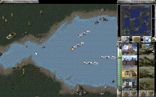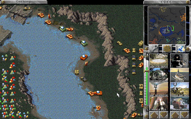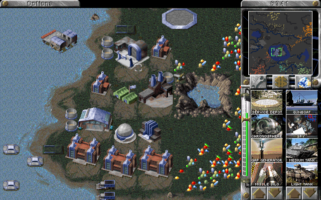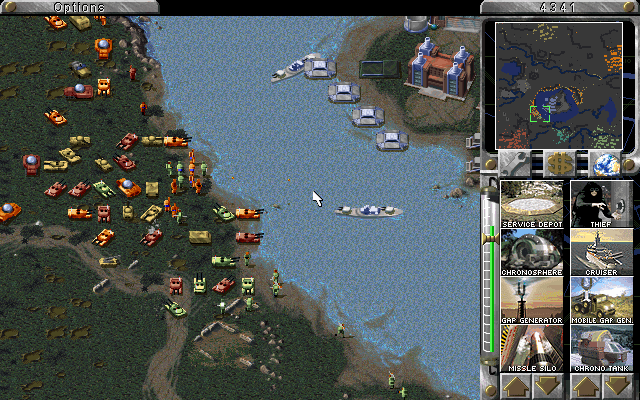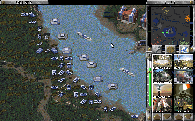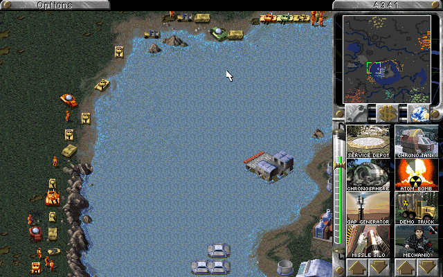 The map shown here is the 'Diamonds Aren't Forever' mega map (thanks to Kristian Reinertsen for reminding me of that). Anyways, I was being utterly beaten by all the AI allied against me, so I withdrew to the gemfield island in the middle, destroying the bridge as I went. I was thus safe to observe the AI and build my invasion forces. Establishing a base was a lengthy process at first since the island was completely gem-filled and I had to force fire upon my own ore trucks to remove enough gems to get a base built. After a while I had an army assembled and was able to land a unit as a test. As soon as that unit hit the ground, all AI teams sent everything they had to that spot. And as you'll see from the screenshots, that's a lot of men and equipment. My cruisers spent the best part of an hour shelling them into oblivion, and then it was time for Overlord... D-Day eat your heart out.