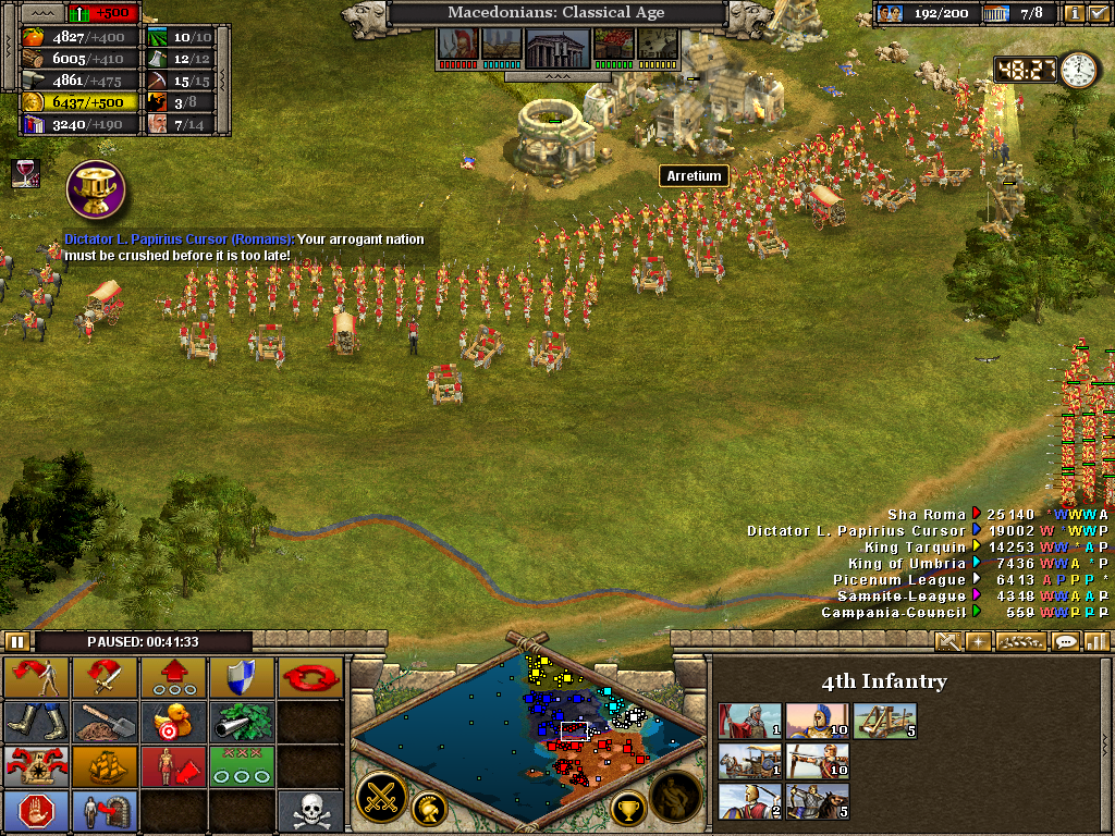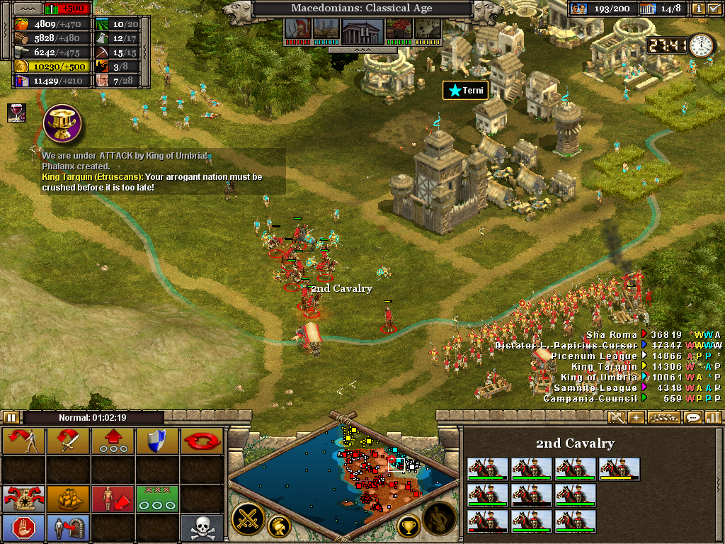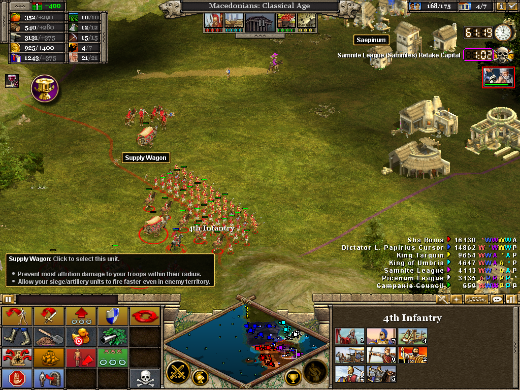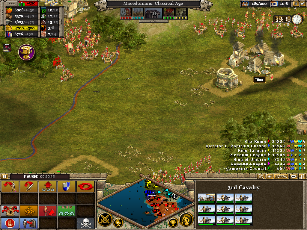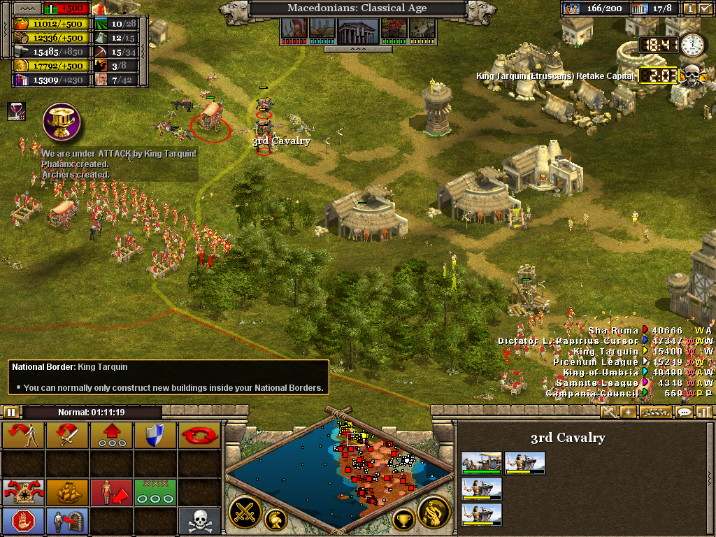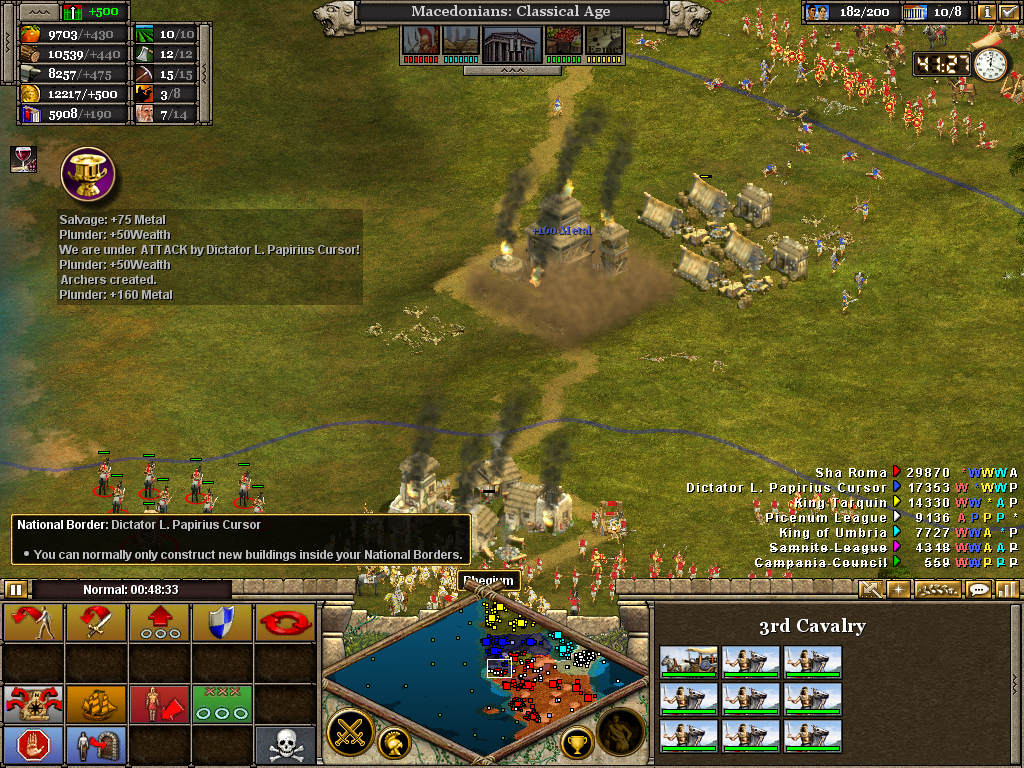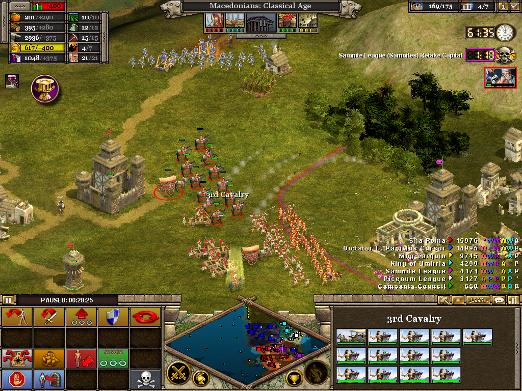Here the 3rd (Light) Cavalry protects the flank of a force assaulting the Samnite League. Alexander himself is with the 1st Infantry as the artillery opens fire on a border fort. The force will likely have to turn to face an incoming Roman attack. Luckily, before wheeling was ordered, the Romans retreated without offering combat. It also necessary to operate on several fronts at once. Seasoned veterans of Rise of Nations will be aware of the advantage in pausing the battle to issue orders.