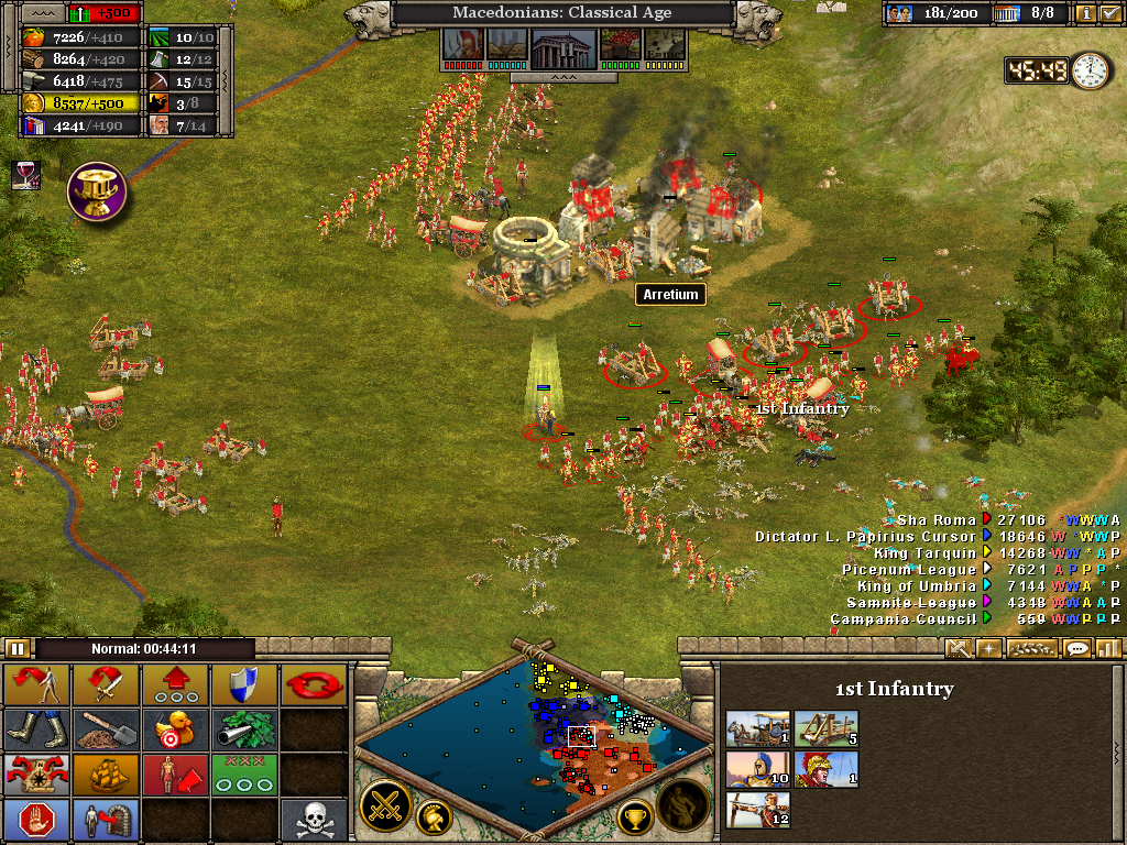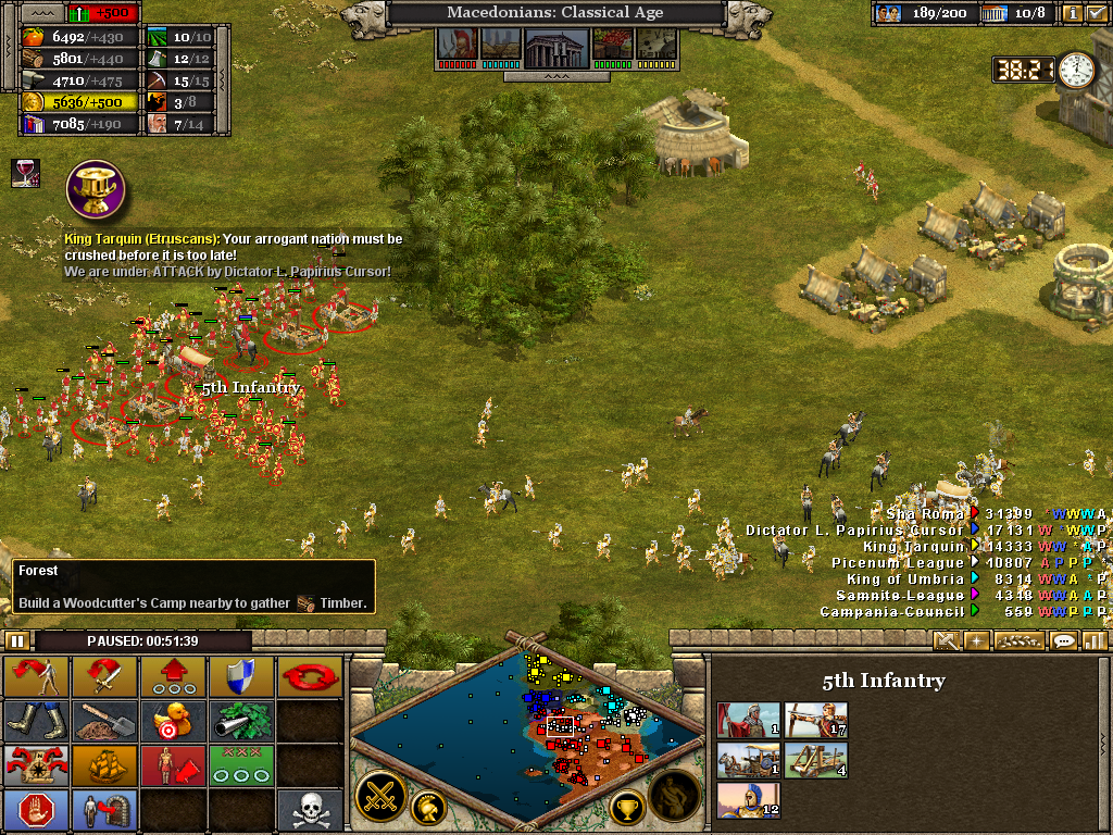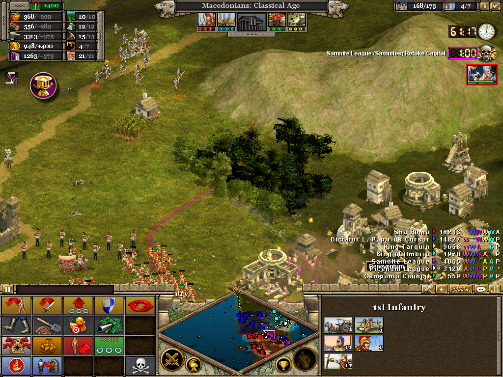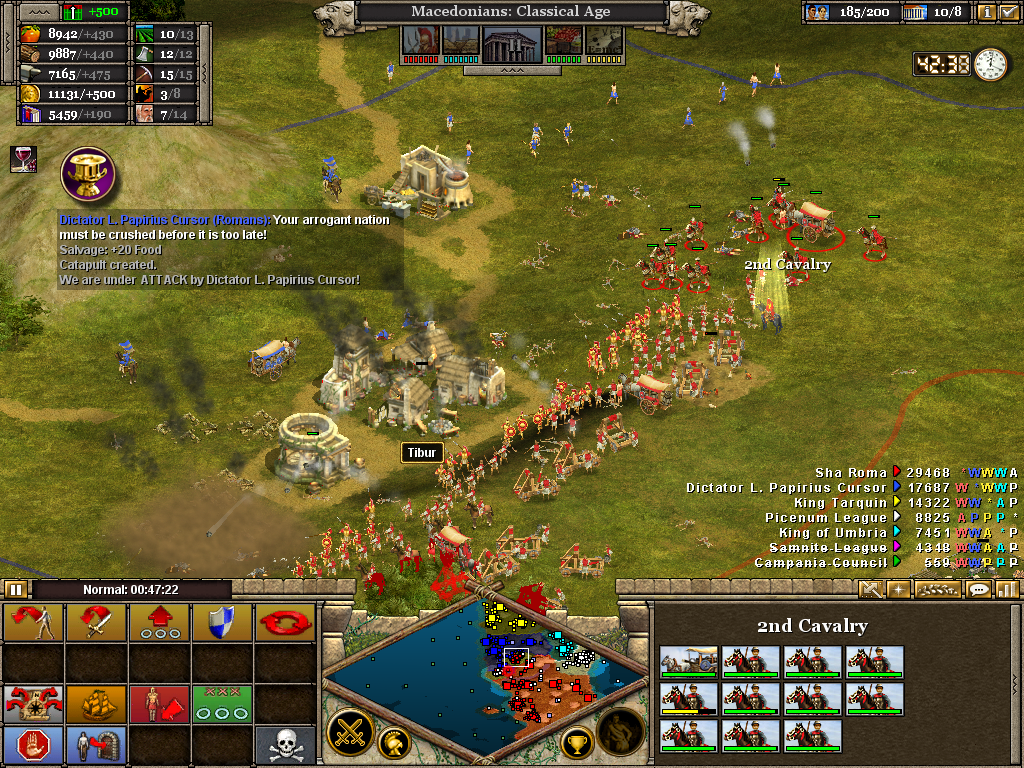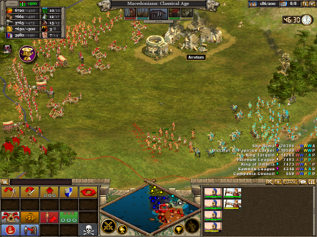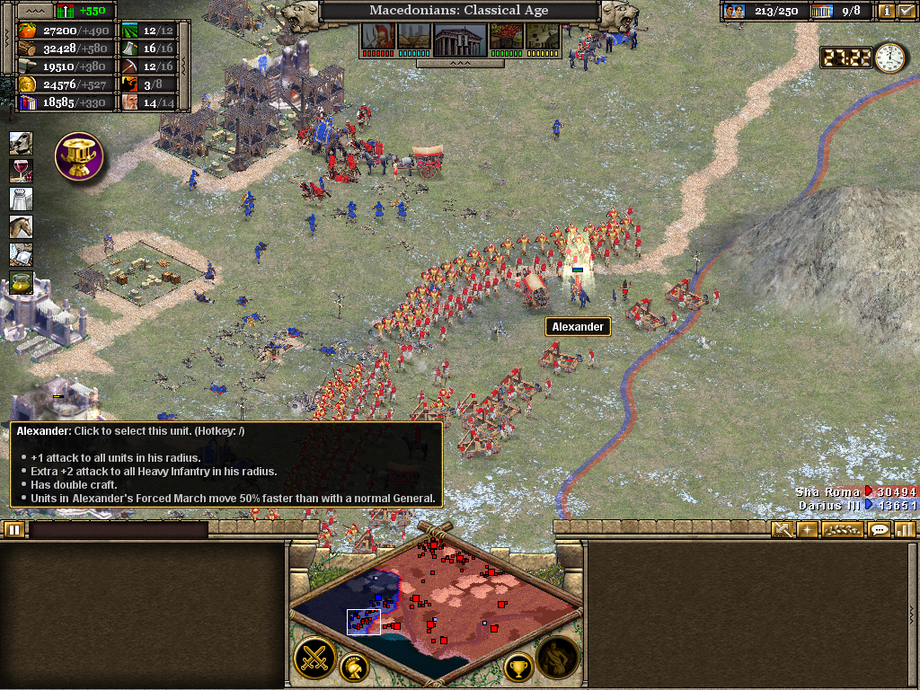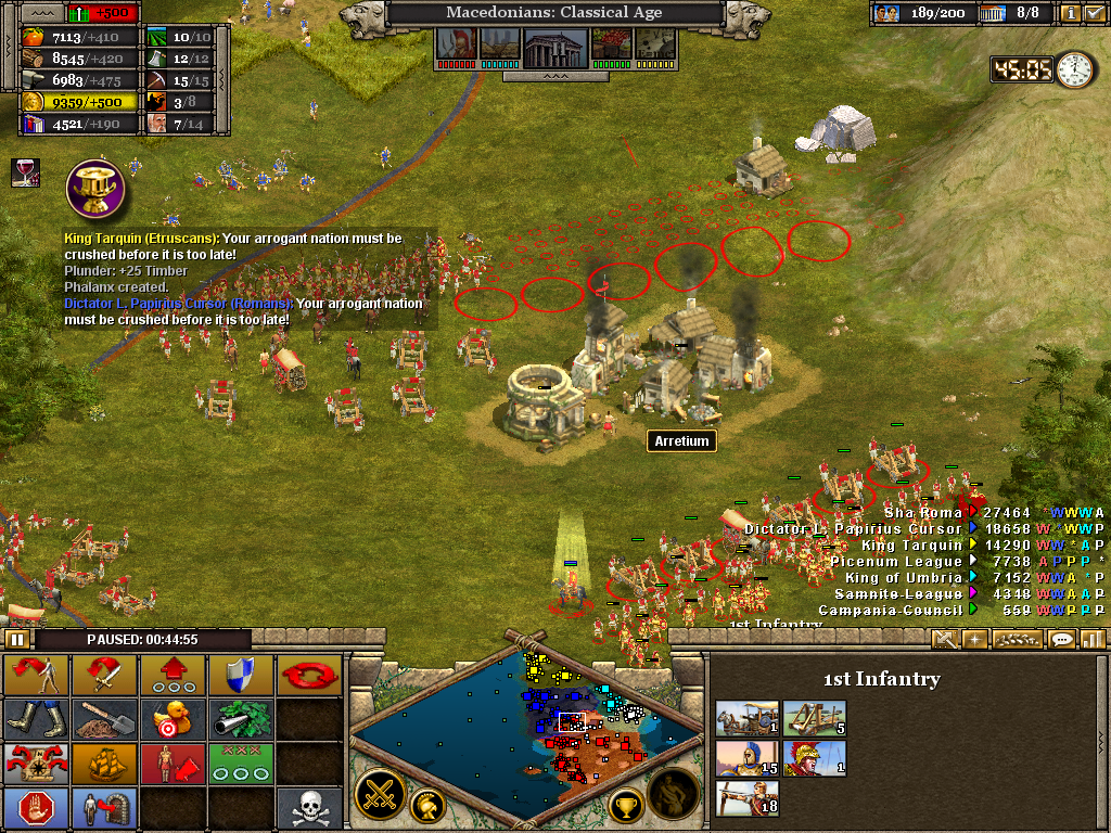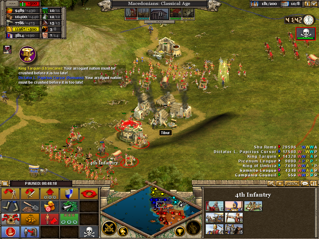 Here the 3rd (Light) Cavalry protects the flank of a force assaulting the Samnite League. Alexander himself is with the 1st Infantry as the artillery opens fire on a border fort. The force will likely have to turn to face an incoming Roman attack. Luckily, before wheeling was ordered, the Romans retreated without offering combat. It also necessary to operate on several fronts at once. Seasoned veterans of Rise of Nations will be aware of the advantage in pausing the battle to issue orders.