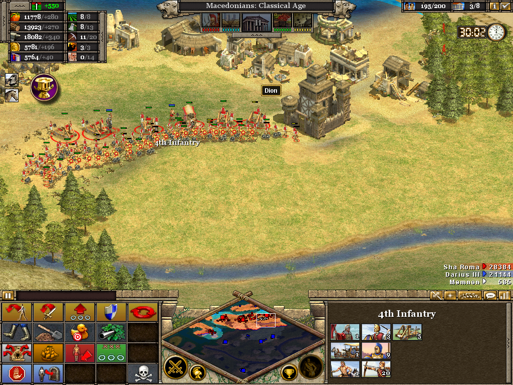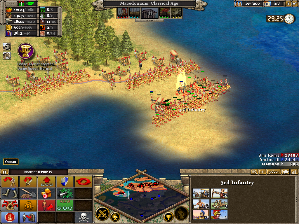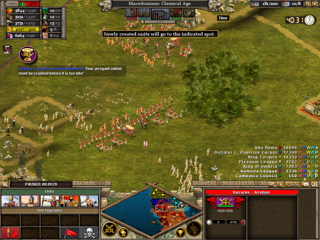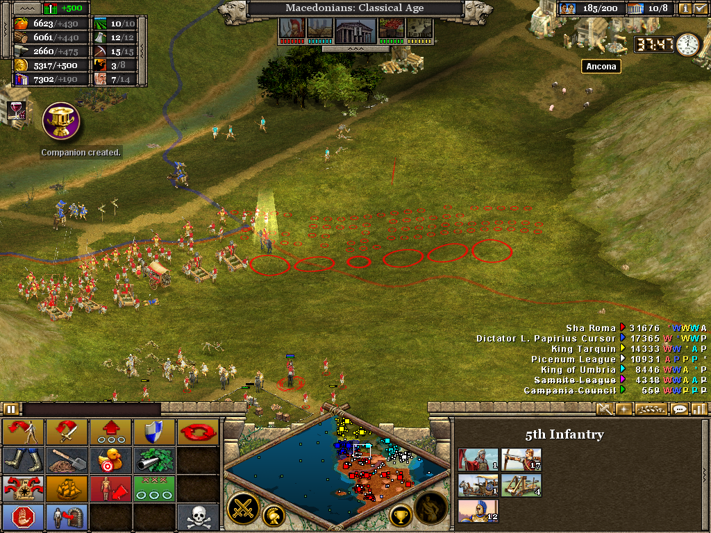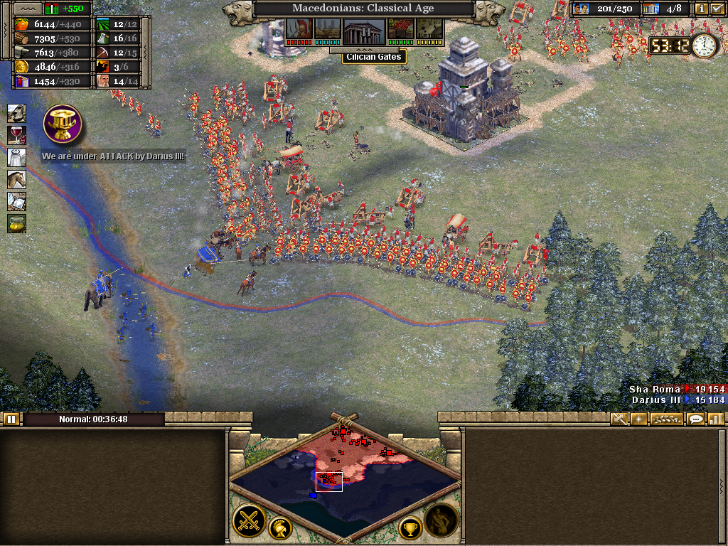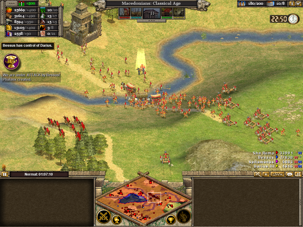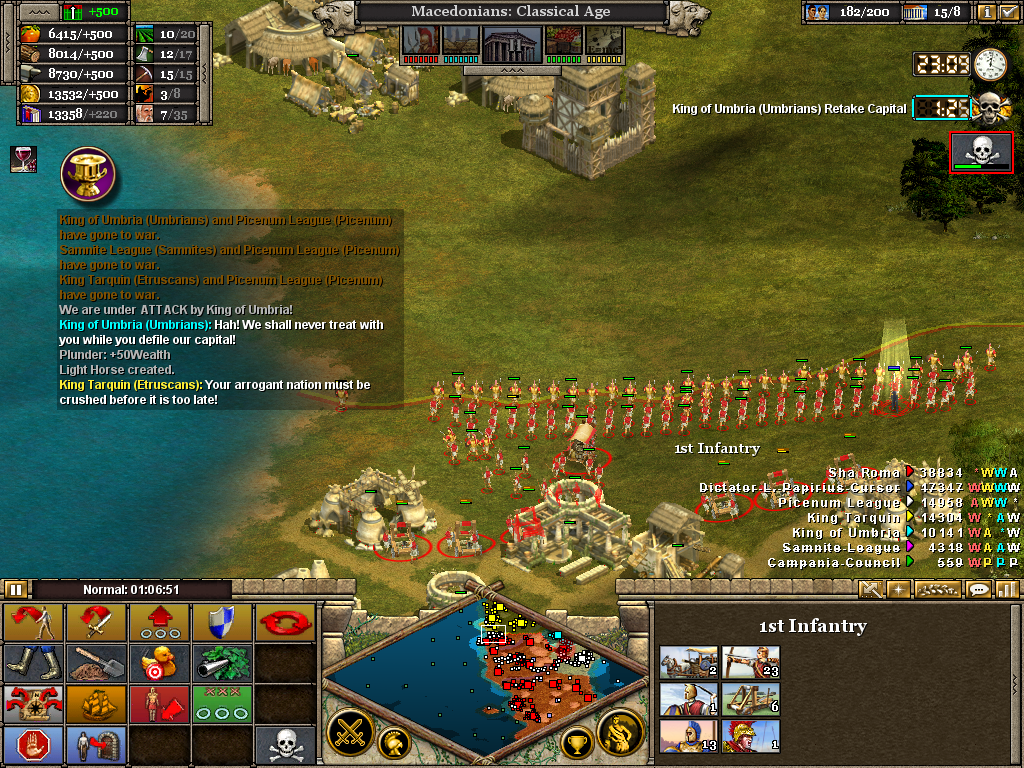 Here the 3rd (Light) Cavalry protects the flank of a force assaulting the Samnite League. Alexander himself is with the 1st Infantry as the artillery opens fire on a border fort. The force will likely have to turn to face an incoming Roman attack. Luckily, before wheeling was ordered, the Romans retreated without offering combat. It also necessary to operate on several fronts at once. Seasoned veterans of Rise of Nations will be aware of the advantage in pausing the battle to issue orders.