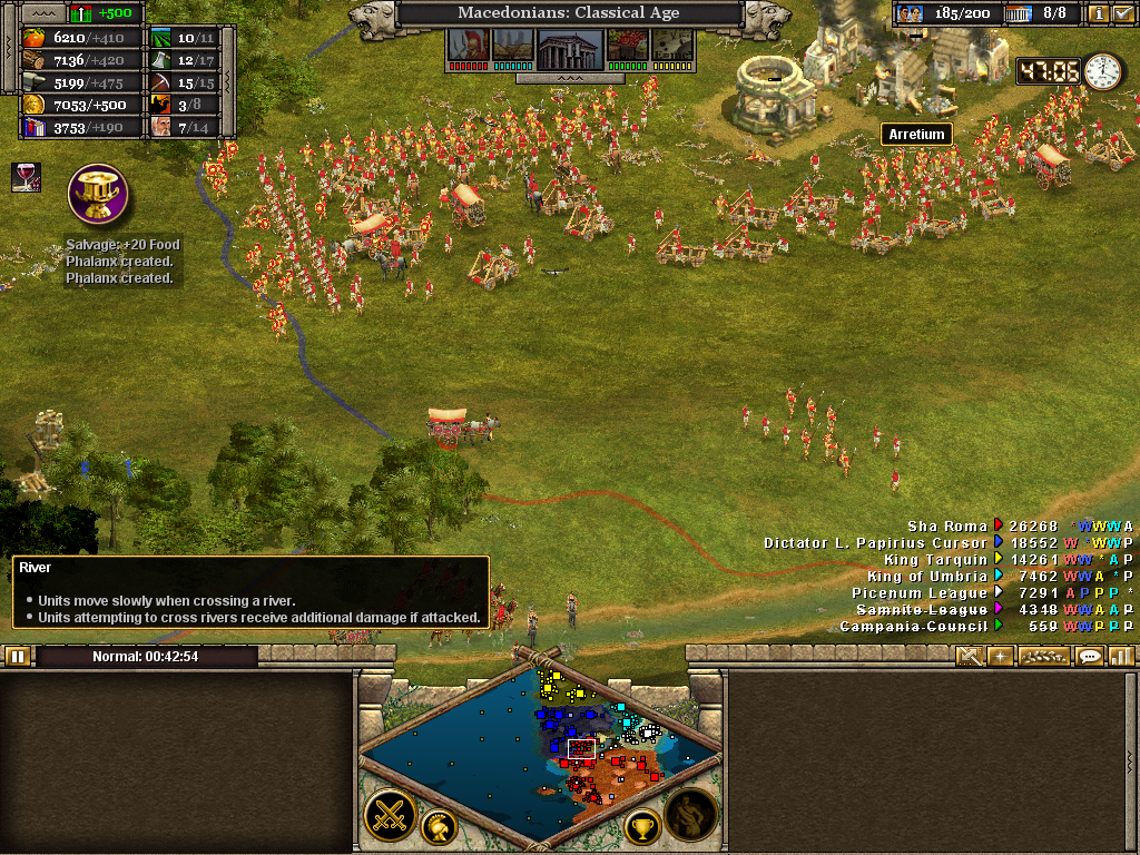 To strengthen the border, citizens are constructing a new fort. With the Samnite League defeated, attention turns to the northern flank and the Roman forces, caught in disarray in the river, are mercilessly cut down in retreat. Their General Staff will be lucky to escape intact - sniping enemy Generals offers a reward in gold coin and it's one extra unit they have to build now. The 2nd (Heavy) Cavalry will give chase, but will not venture deep into enemy territory with their own strength so weakened. The infantry will form up and cross in force, supported by Alexander's own regiment stationed further up the river.