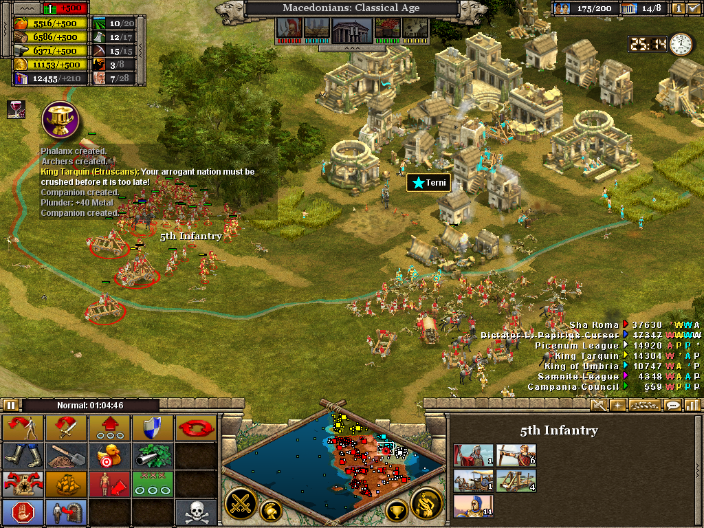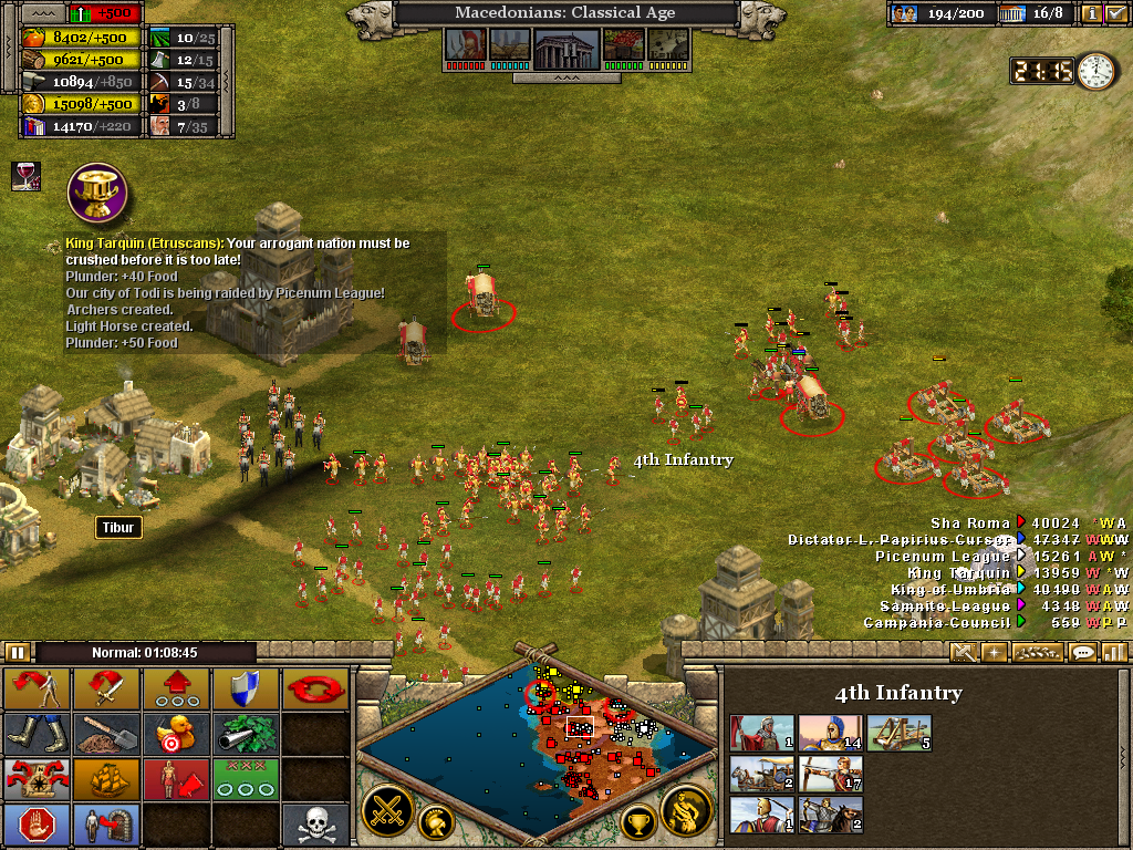 The 4th and 1st now redeploy to protect Tibur as it burns. The 4th in particular is in need of replacements. With 40 minutes to go and four enemies still remaining, there can be little respite before the advance is once again ordered. The 5th is off-screen laying siege to Rhegium.