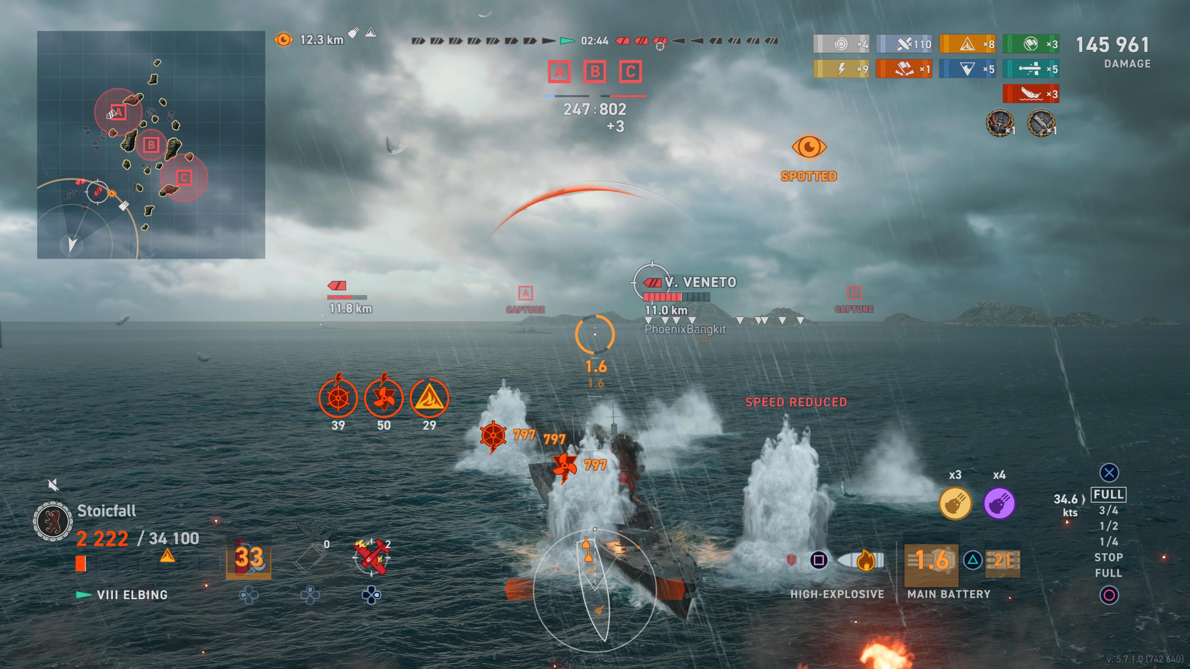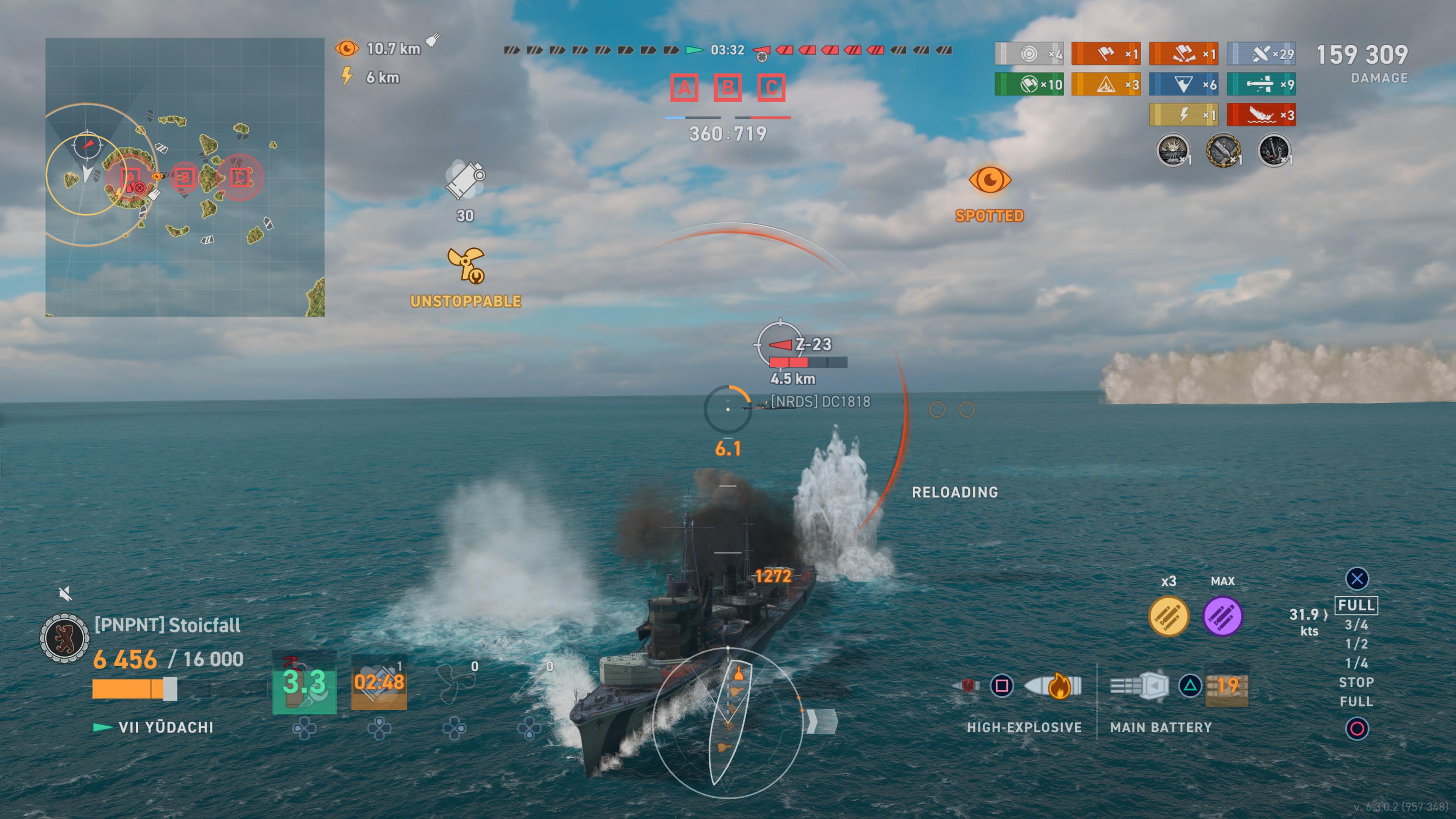 Blind Firing is when you aim to score a hit on an enemy ship which isn't detected, either by vision, sonar, or radar. When an enemy commander is firing at you and you're hidden in smoke or spotted only on the minimap, take note. It means they know their business. After a while, firing at muzzle flashes and scoring hits is not only possible, it is relatively simple. An enemy commander who sits inside or behind a smokescreen and remains stationary, firing away, makes themselves a target not only for torpedoes but also blind fire. Since we are aiming at muzzle flashes, it's not true blind firing as we have some form of visual reference. In this example, I was detected by enemy sonar, could not see them, and still managed to successfully blind fire using muzzle flashes (whilst burning a Bismarck on the side).