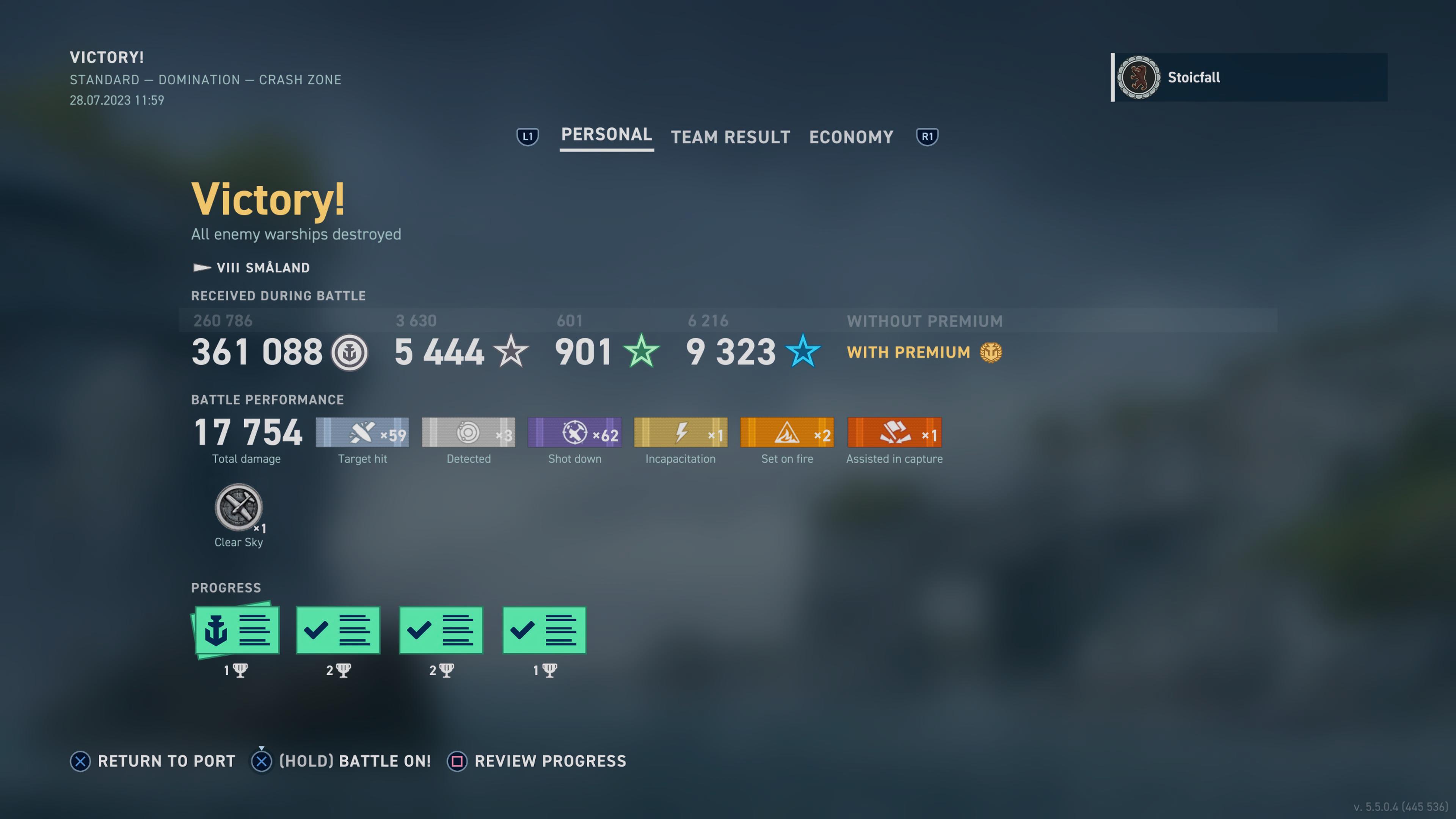 With the old carrier mechanics, if you shot down 20 enemy aircraft, you earned a Clear Skies medal. This is definitely one of the more rewarding medals. However, this medal can only be earned once per battle. 62 was my record prior to 2024, achieved in Småland. The updated 2024 carrier mechanics made it easier to shoot down planes. The medal requirement was therefore increased to 40. 66 was my record, achieved in Friesland. On 18 November 2024, the medal requirement was reduced to 30 planes shot down. This is a fair change since I only managed to attain this medal three times when 40 planes was needed. On 5 January 2025, I achieved 96 planes shot down in Friesland. On 5 October 2025, I achieved 119 planes shot down in Friesland, which remains my second best XP game (4,911 base).