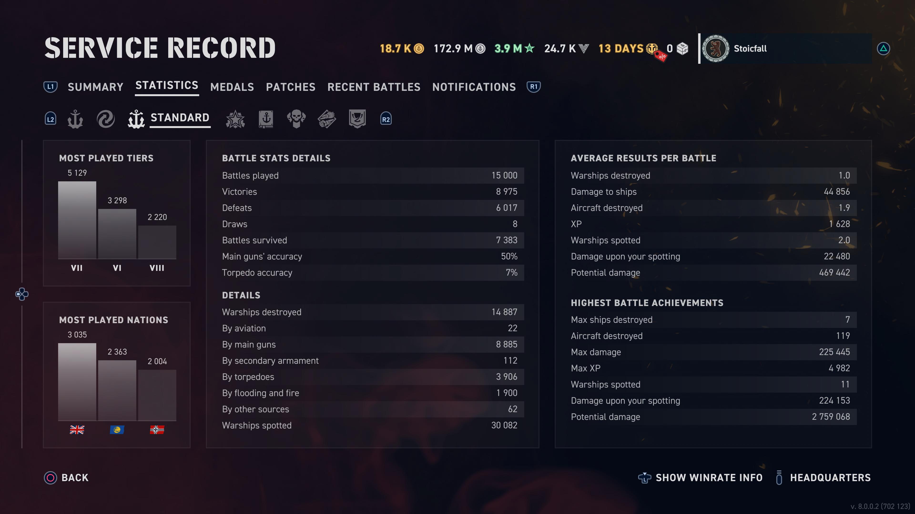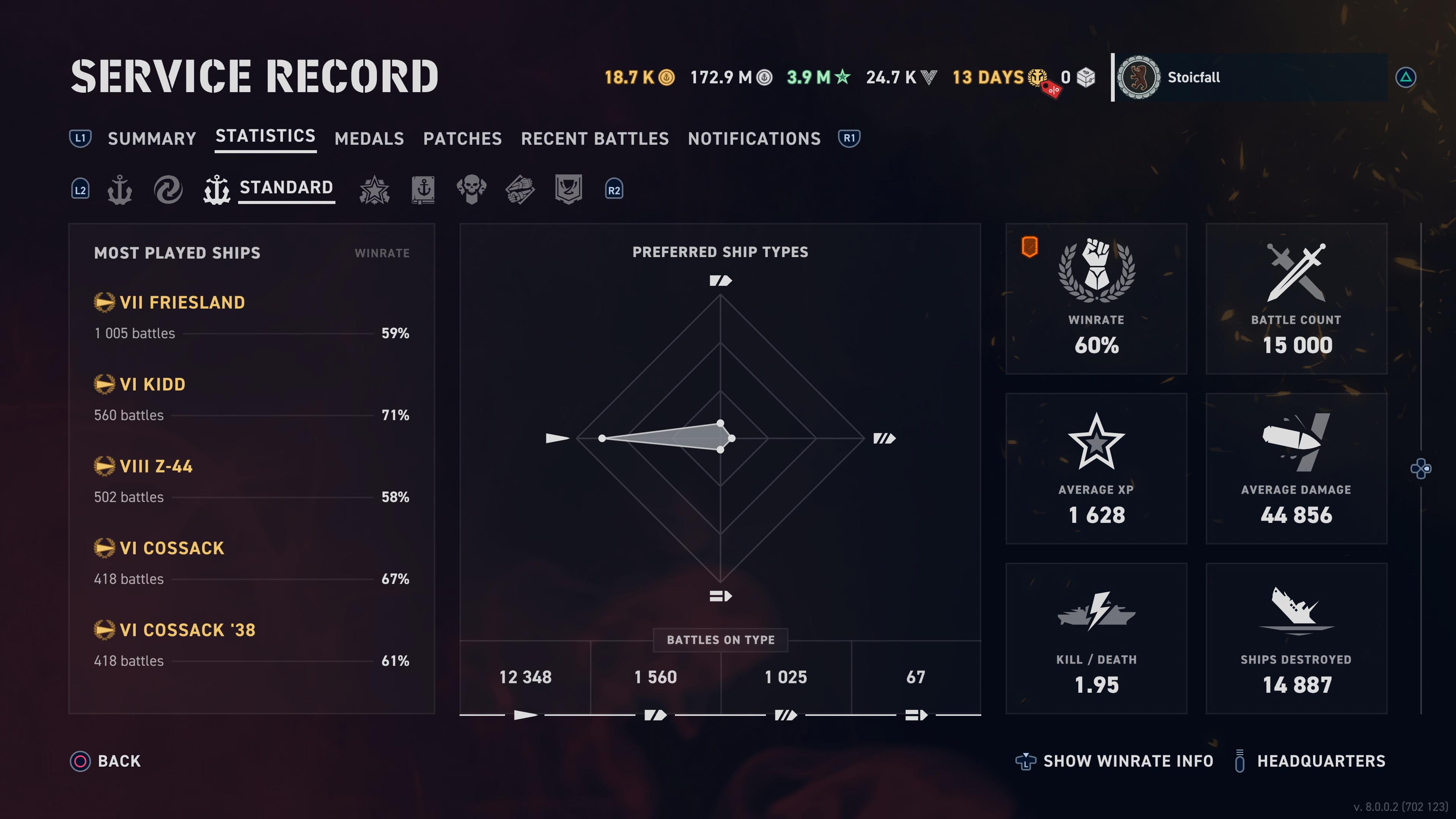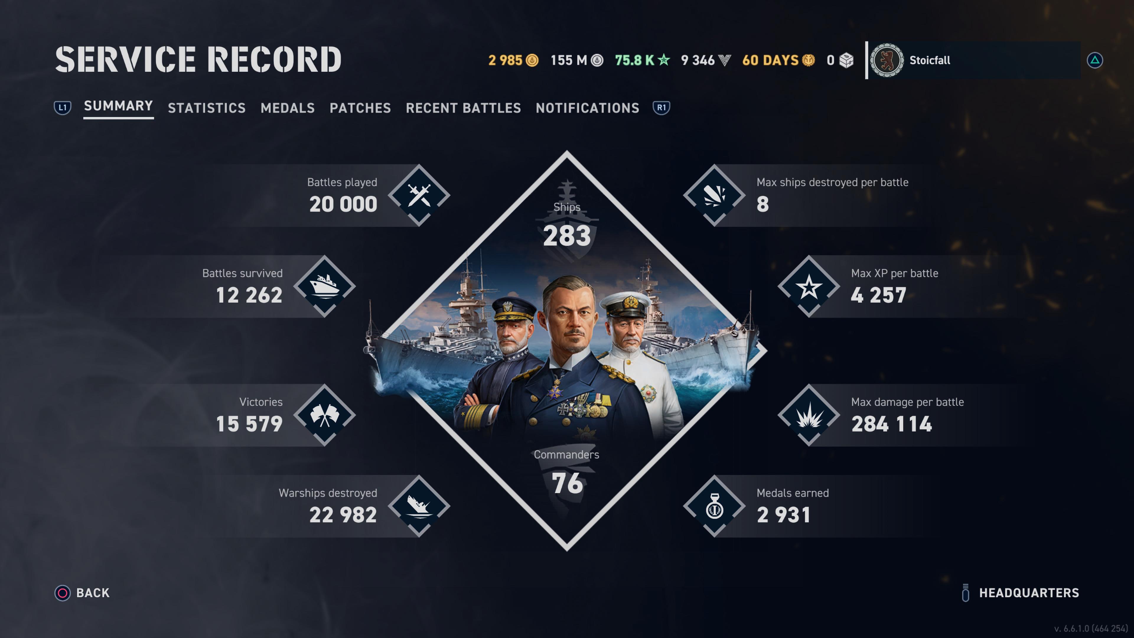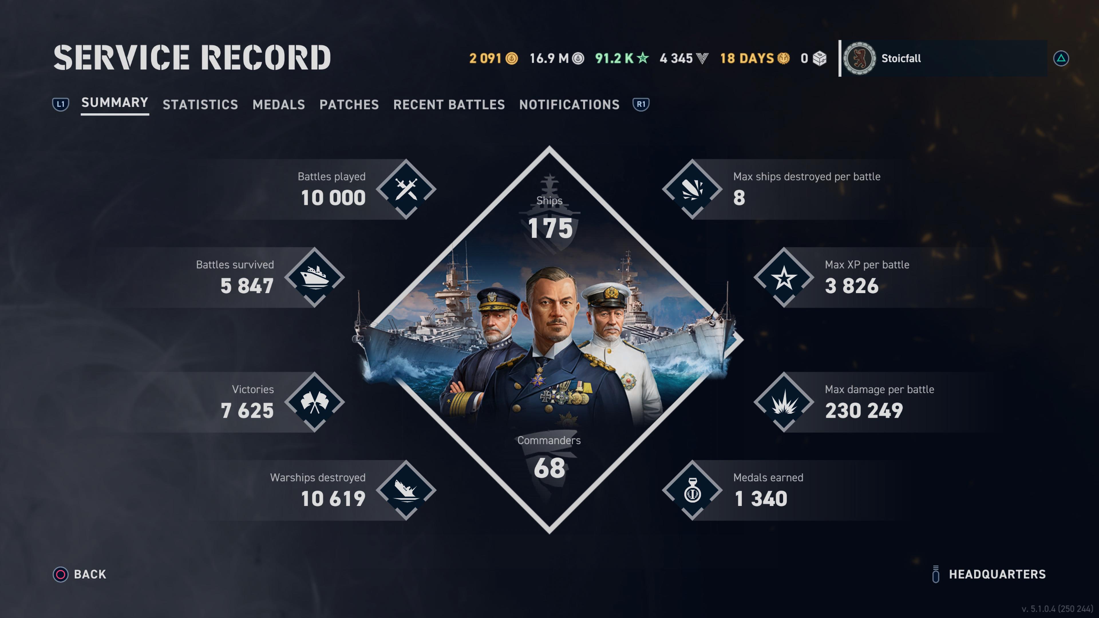 This game has quite a few statistics but a lot more would go a long way into making such records more useful. For example, the ability to compare ships side by side, which ships have won which medals, the total amount of ribbons earned as well as per ship. I would like to see displayed the ship with the highest winrate, most medals, best accuracy, most damage, winrate by tier, which ships make the most money, the date each ship was acquired, etc. I am interested in every single metric that has been measured, from total distance travelled to time spent at 3/4 speed. The circular arrangement of the Stats Summary screen should feature selectable segments which offer a more detailed breakdown. Clicking on a medal should reveal when it was acquired and with which ship. A daily progress chart would also be helpful, displaying how much of each resource has been earned that day, and in which ship. Why don't the game's commanders get their own stats?